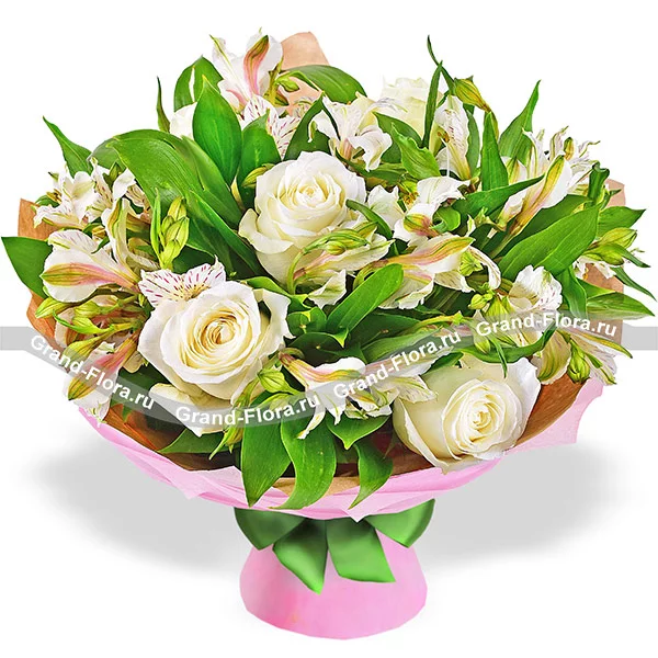 Букет выполнен из нежных кремовых роз, в дополнении кристально - белой альстромерии в окружении декоративной зелени, фетра в тон букету и розового банта.