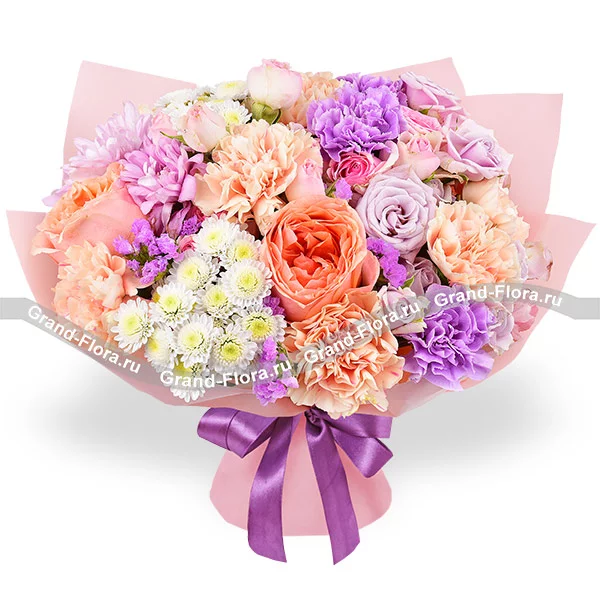 Стандартный: роза персиковая - 2 шт.,гвоздика персиковая - 5 шт., гвоздика фиолетовая - 2 шт., роза кустовая розовая - 2 шт., роза кустовая фиолетовая - 2 шт., хризантема кустовая ромашковая фиолетовая - 2 шт., хризантема сантини - 2 шт., статица, упаковка, лента. Примерный размер: 35Х35 см.