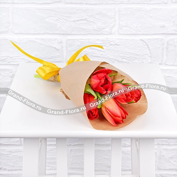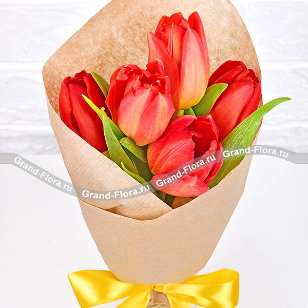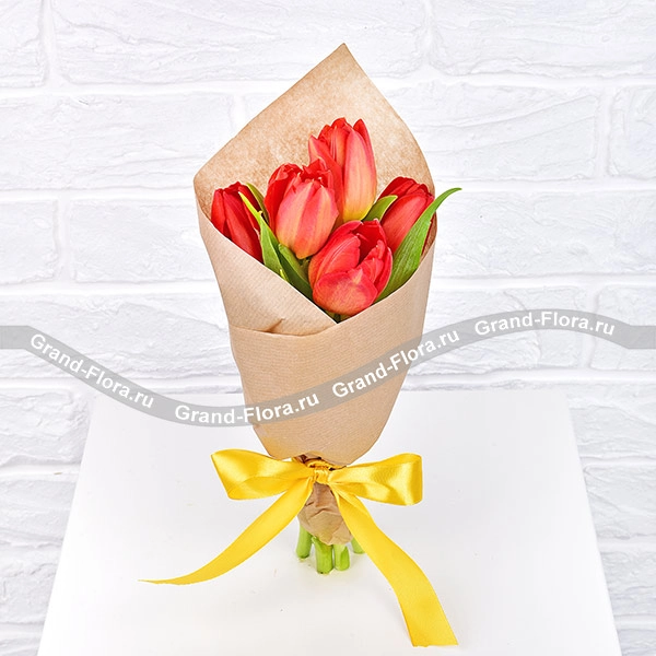 5 тюльпанов: тюльпан красный - 5 шт., упаковка крафт, лента.